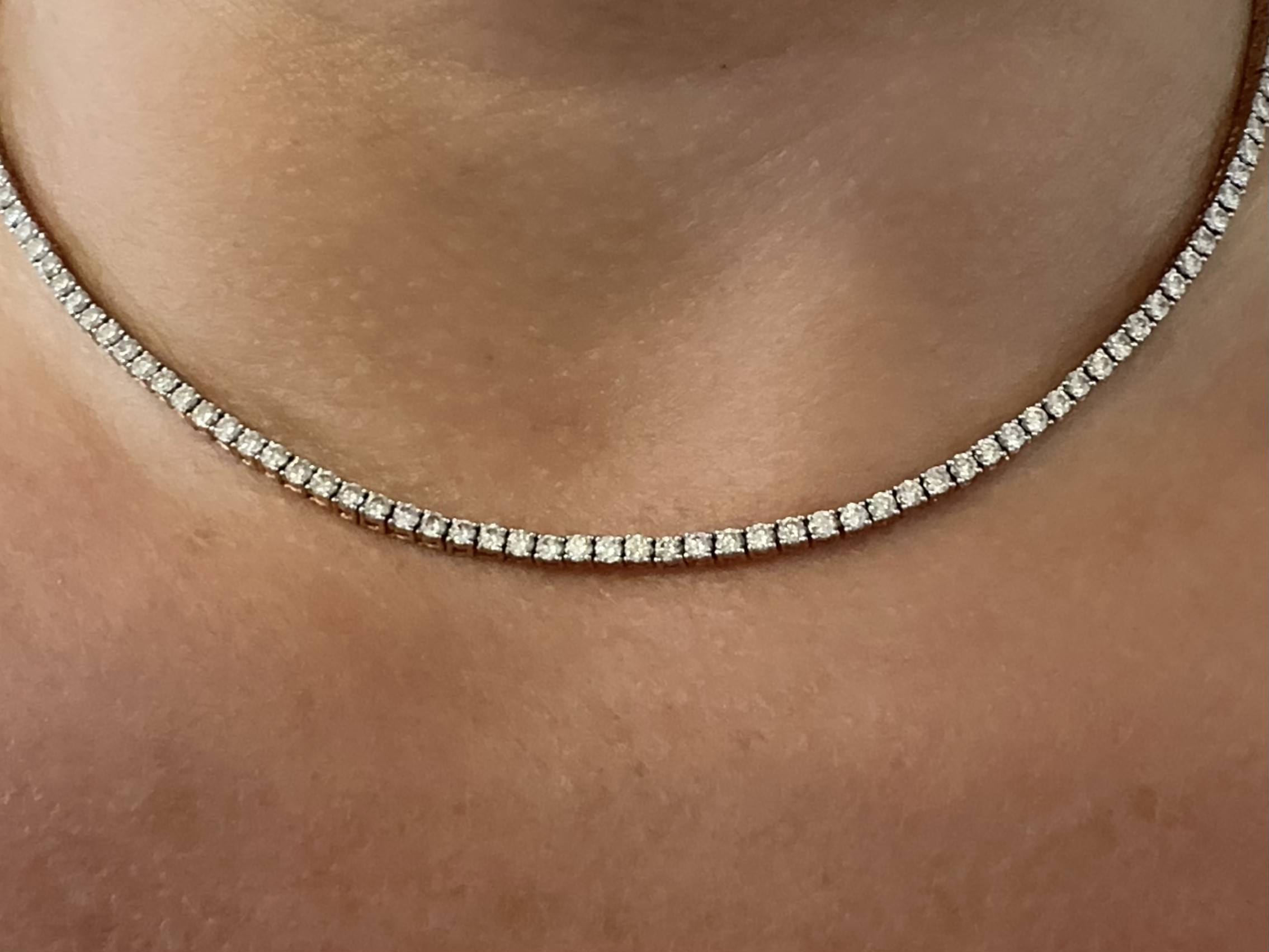Each diamond is hand-selected for its brilliance, set in a classic tennis design that drapes elegantly around your neckline. The warm tones of rose gold perfectly complement the natural sparkle of the diamonds, making this necklace a refined addition to any fine jewelry collection.